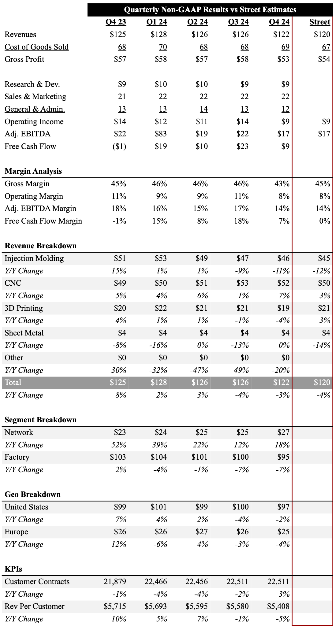 Protolabs delivered 4Q24 revenue of $121.8M, reflecting a slight ~3% decrease Y/Y, but came in at the upper-end of Managements prior guidance ($115-123M) and consensus ($120.2M). Growth was driven by strong performance in the Protolabs Network, which fulfilled $26.5M in revenue, representing a ~18% Y/Y increase. However, revenue in the traditional Factory segment was down ~7% Y/Y as challenging manufacturing environment continues to act as a headwind. CNC revenue increased ~7% Y/Y to $52.4M, while Injection Molding revenue declined ~11% Y/Y to $45.6M and 3D Printing declined ~4% Y/Y to $19.5M. While the company did not breakout Customer Contacts (aka unique customers) in the quarter, Customer Contacts for the year was 51,552, which was down ~4%. That said, revenue per Customer Contacts was up ~3% Y/Y for the year. From a geographic perspective, revenue in the United States declined ~2% Y/Y to $96.6M and Europe declined ~4% Y/Y to $25.2M.