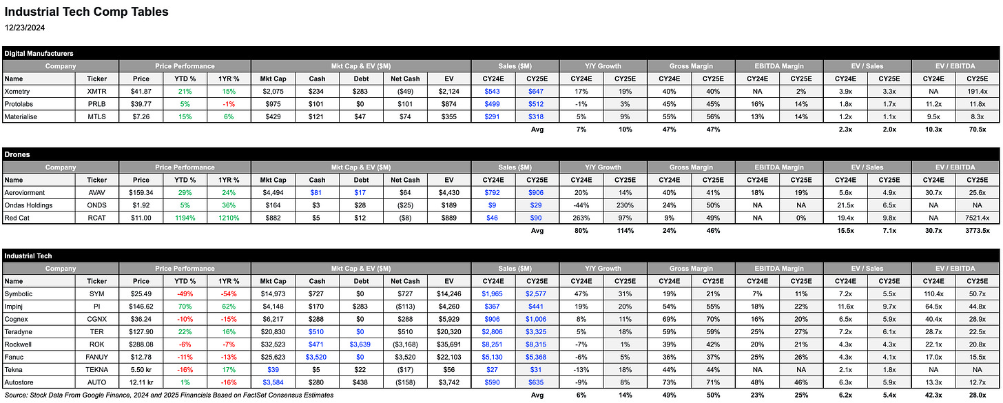 When performing a comp analysis investors will need to create comp tables, which consist of companies in the same industry (i.e. industrial automation) or with similar business models (i.e. software-as-a-subscription). See our industrial automation comp table below. (Note Google Sheets is a great tool to create comp tables with their Google Finance functions.) The financial metrics used in this table are consensus estimates, which is the average estimate of all sell-side analysts covering a specific company. (We dive deeper into consensus estimates in the Sell-Side Overview section below.) The advantages of comps are that they are always current, and it’s easy to find financial information on public companies.